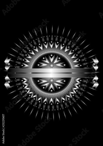 Obraz premium Silver round frame of round beads with an oval of silver arrows and stars on a black background with silver rays and a double silver ribbon
