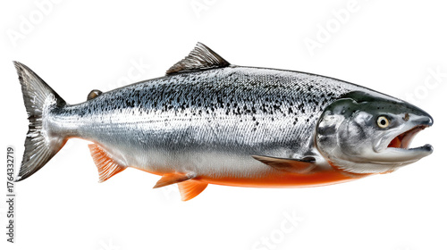 Naklejka premium Silver Salmon Portrait: A close-up shot of a silver salmon, showcasing its sleek body and unique features. Captured in pristine clarity, highlighting its fresh, vibrant appearance.