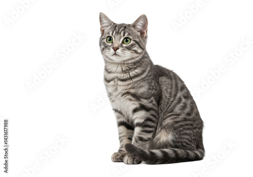 © Elsha, Obraz premium Silver tabby cat alert green eyes sitting posed on black curious gaze beautiful fur texture