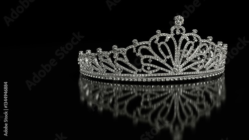Fototapeta premium Silver tiara adorned with diamonds Reflected on dark surface, symbolizing...