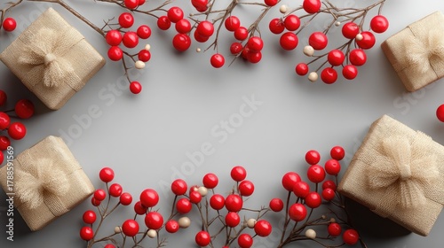 © lililia, Obraz premium Silver wrapped gifts and ornaments are surrounded by red berries and green branches, creating a joyful holiday display for celebrations