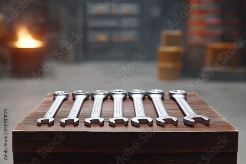 © SolaruS, Naklejka premium Silver wrenches aligned on wood surface in workshop, fire burning in background. Concept engineering, mechanics, repair, industry. Great for blogs and advertising.