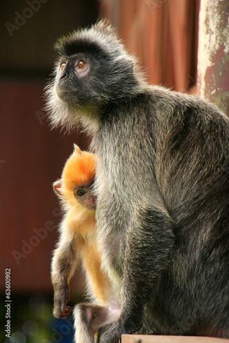 © donyanedomam, Fototapeta premium Silvered leaf monkey with a young baby, Borneo, Malaysia