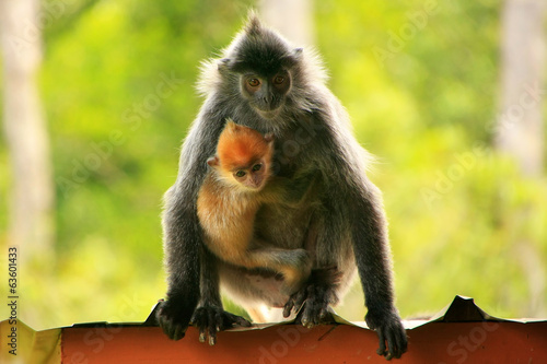 © donyanedomam, Fototapeta premium Silvered leaf monkey with a young baby, Borneo, Malaysia