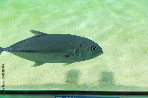 Naklejka premium Silvery blue fish swimming in clear shallow water, streamlined body and...