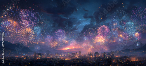 © Audrey, Fototapeta premium Silvester, New Year's Eve, Festival Party New Year 2026, new years eve Fireworks background banner panorama - firework and sparklers on rustic dark blue night sky texture