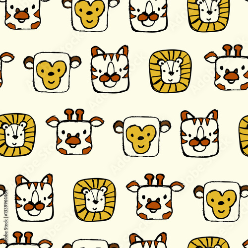 © Viola, Fototapeta premium Simple animal seamless pattern. Background with lion, monkey, giraffe, and tiger.