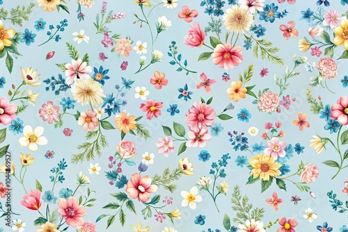 © Latsamee, Obraz premium Simple, beautiful flower pattern on blue background with pastel colors