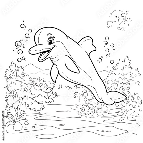 © Wachirasak Jamwimol, Fototapeta premium Simple Black and White Dolphin Coloring Page for Kids and Adults