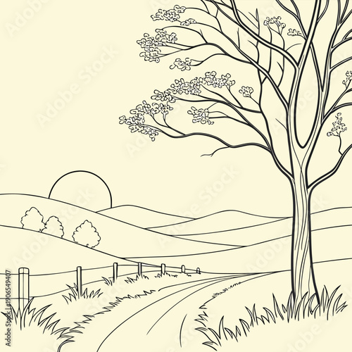 © Chin2, Fototapeta premium Simple black and white drawing of a country road winding toward a distant sunset