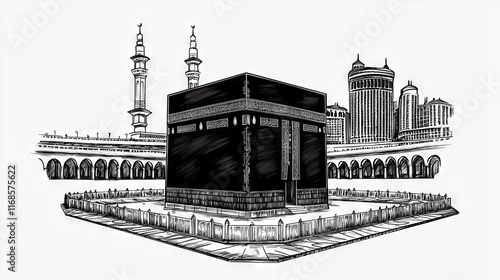 Fototapeta premium Simple Black and White Drawing of Kaaba in Mecca, Minimalistic Ink Sketch