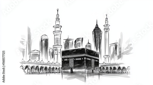 Fototapeta premium Simple Black and White Drawing of Kaaba in Mecca, Minimalistic Ink Sketch