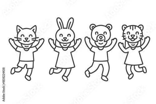 © Andrei, Naklejka premium Simple black and white four cheerful animal characters jumping with raised hands