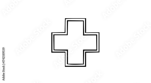 Fototapeta premium Simple black and white illustration of a cross shape with a double outline on a white background.