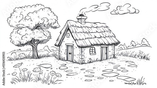 Obraz premium Simple black and white sketch of a thatched cottage