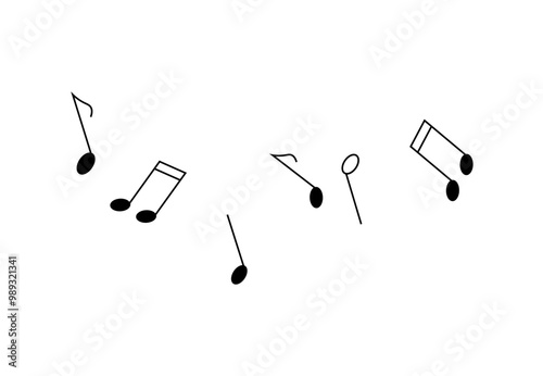 Fototapeta premium Simple black music notes on a white background scattered randomly around. Ideal for music education graphics, musical event flyers, app icons, wallpaper design, and stationary decoration. Minimalist