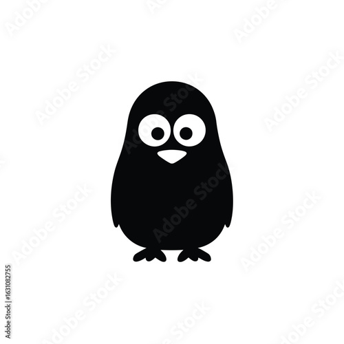 © XsDax, Naklejka premium Simple black silhouette of a cute cartoon bird character with large, expressive eyes. A minimalist animal logo or icon design isolated on a white background.