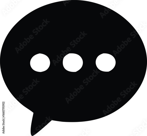 Fototapeta premium Simple black speech bubble icon with three white dots representing conversation or ongoing message activity for digital communication platforms.
