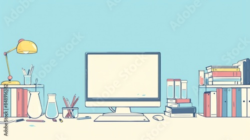 © adi, Obraz premium Simple blank template for animated background with outline of computer, book and test tube on one side. with copy space for text