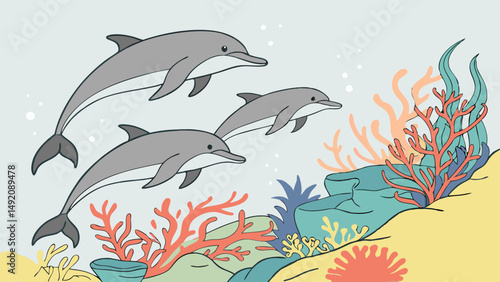 Naklejka premium Simple Cartoon Illustration of Three Dolphins Swimming Underwater by Colorful Coral Reef and Rocks
