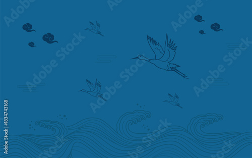 © oktamaulana, Obraz premium Simple Chinese Japanese Style Crane blue Background