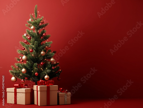 Obraz premium Simple Christmas Tree with Presents on a Red Background 빨간색 배경에 선물이 있는 심플한 크리스마스 트리