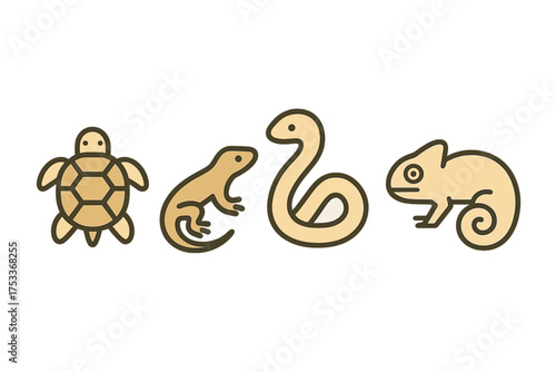 Obraz premium Simple collection of four stylized reptile animals: turtle, lizard, snake, and chameleon