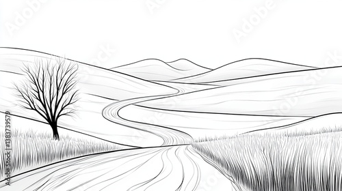© Sutat, Obraz premium Simple Coloring Book Page Featuring A Snowy Road Through A Tranquil Winter Landscape