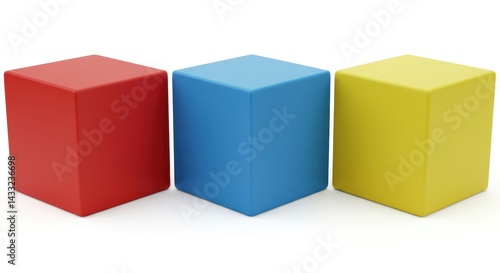 Fototapeta premium Simple 3D render of three cubes placed side-by-side, each a different bright solid color (e.g., red, blue, yellow). Clean separation between cubes