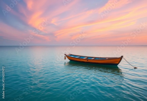 © Krit, Naklejka premium Simple flat-bottomed boat on calm water, serene scene, lake, raft