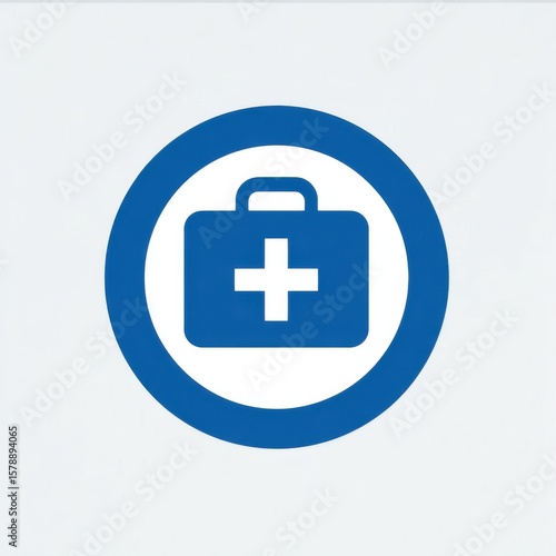 © na, Obraz premium Simple flat-style blue first-aid kit icon with white cross, handle on top, encircled by thick blue ring, clean design on white background.