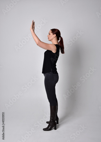 Obraz premium Simple full length portrait of woman with red hair in a ponytail, wearing casual black tshirt and jeans. Standing pose with in side profile, against a studio background.