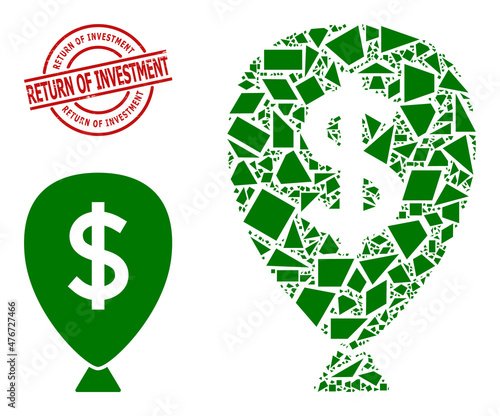 Obraz premium Simple geometric financial inflation balloon mosaic and Return of Investment rubber stamp seal. Red stamp seal includes RETURN OF INVESTMENT text inside round and lines form.