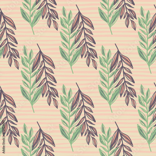 Fototapeta premium Simple herbal seamless pattern with purple and green branches. Foliage silhouettes on light stripped background.