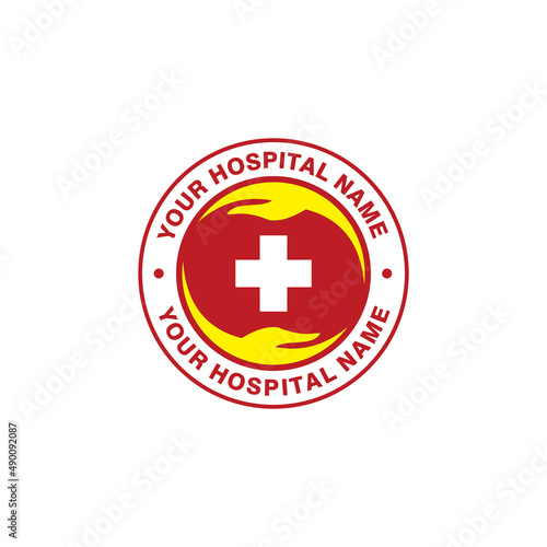 Fototapeta premium simple hospital logo with hands and plus shape design, modern red and yellow...