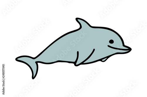 © Maryia, Fototapeta premium Simple icon cartoon smiling dolphin in blue color in flat style on white background. Sticker sign design. Sea silhouette.