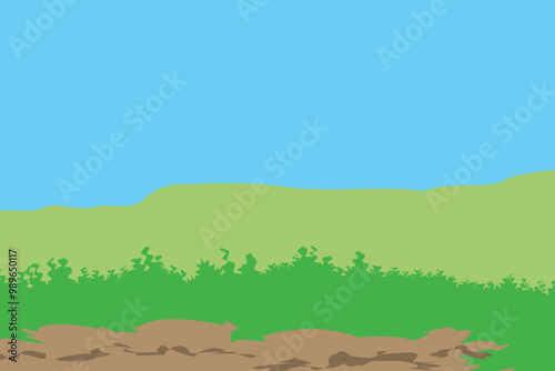 © Fianpanic, Obraz premium Simple illustration of green grass and a brown dirt patch under a blue sky.