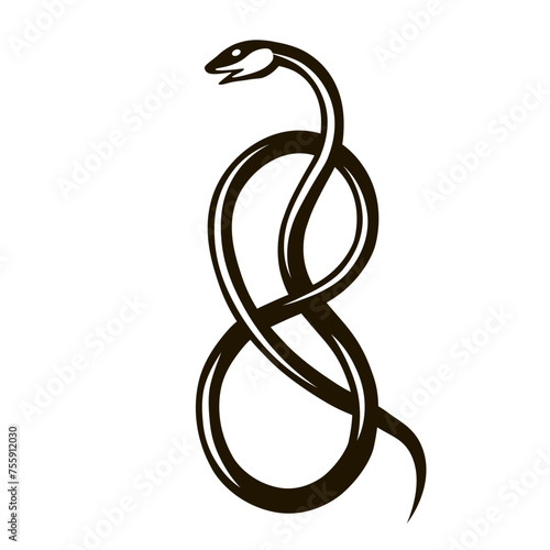 © Nina, Obraz premium Simple illustration of snake with vertical infinity sign body, ouroboros. Symbol, sign, black, icon, silhouette, tattoo, ornament.