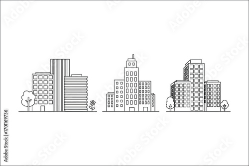 Naklejka premium Simple line art cityscape with buildings trees and a flower architecture urban