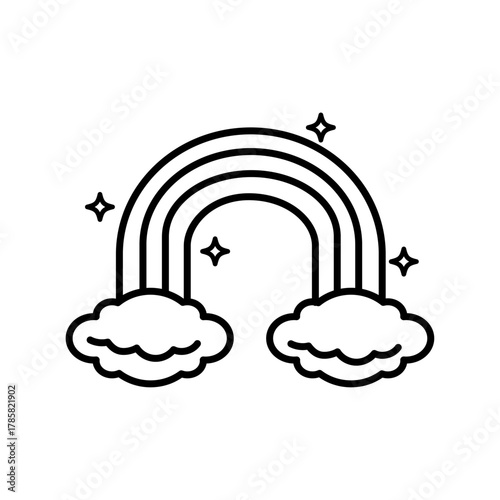 Naklejka premium Simple Line Art Icon of a Rainbow Arching Over Two Clouds with Sparkles -...