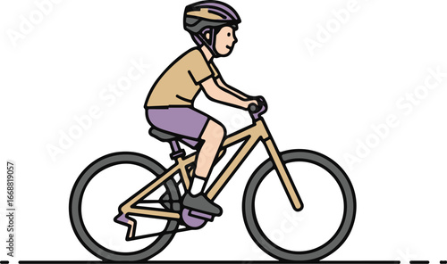 © muhamad, Obraz premium Simple line art illustration of a person wearing a helmet and casual clothes riding a bicycle, side view.