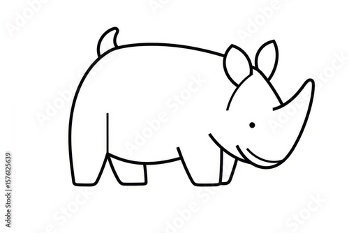 Fototapeta premium Simple line drawing of a cute African rhinoceros, minimalistic doodle style, bold black lines, white background, children's coloring page
