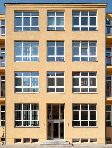 © TimosBlickfang, Fototapeta premium Simple residential building facade with yellow plaster and white windows