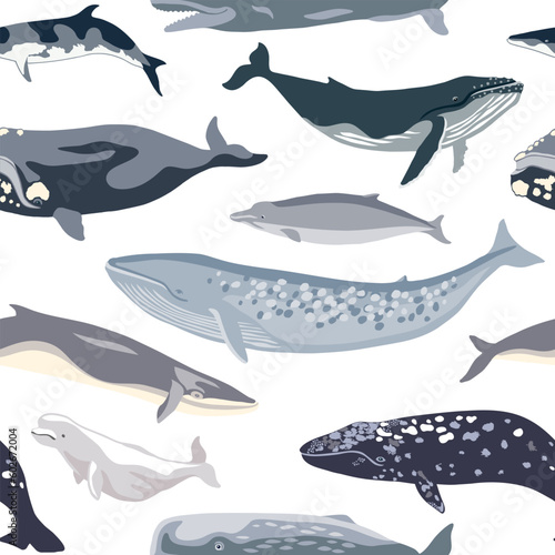 © Marina Gorskaya, Fototapeta premium Simple seamless pattern with different whales.