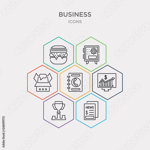 Fototapeta premium simple set of newspaper page, ranking factor, statistical chart, address book icons, contains such as icons empty box, big safe, basic burger and more. 64x64 pixel perfect. infographics vector