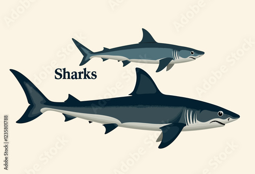 Obraz premium Simple Sharks Poster: Flat Illustration, Muted Colors, White Background, Text