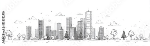© anak, Fototapeta premium Simple sketch of a city skyline, featuring various heights of buildings and small trees, with a few clouds in a minimalist style