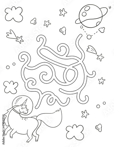 © aliaross, Fototapeta premium Simple space maze with unicorn for kids. Coloring page with labyrinth for kids.