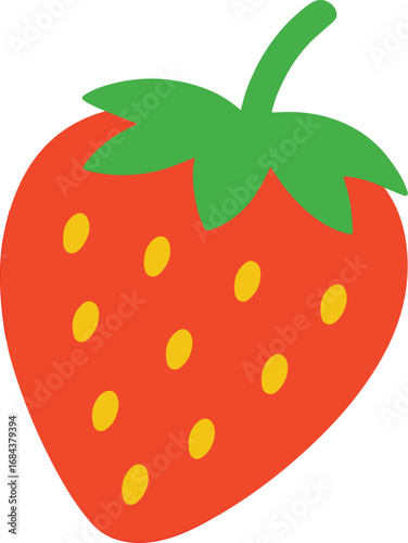 © Monoara, Fototapeta premium Simple Strawberry Vector. Bright Red Fruit with Green Leaves and Yellow Seeds Isolated on White Background