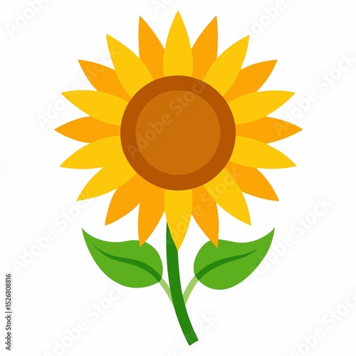 © Shamim, Fototapeta premium Simple Sunflower Illustration with Yellow Petals Brown Center Green Stem and Leaves on a White Background